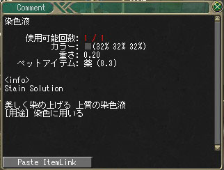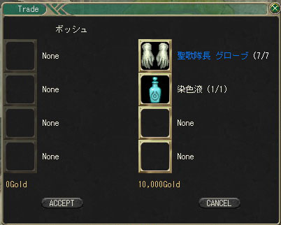 装備品と染色液と10000gをボッシュにトレードすると染めてもらうことができます